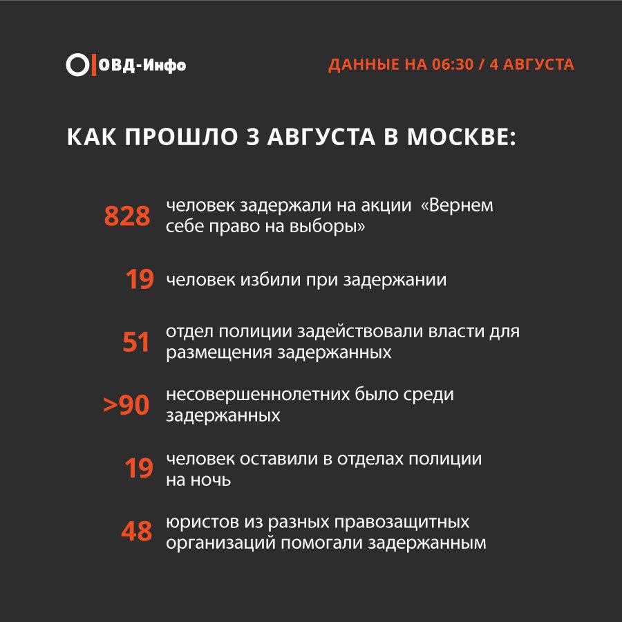 Итоговое число задержанных на московском митинге за честные выборы в субботу, 3 августа, — 828 человек, подвел итоги проект «ОВД-инфо». По данным ГУ МВД Москвы, в акции приняло участие 1,5 тыс. человек, а число задержанных составило 600 человек. В протоколе об административном правонарушении одного из участников акции полицейские, как и 27 июля, оценили число участников акции в 10 тыс. человек.