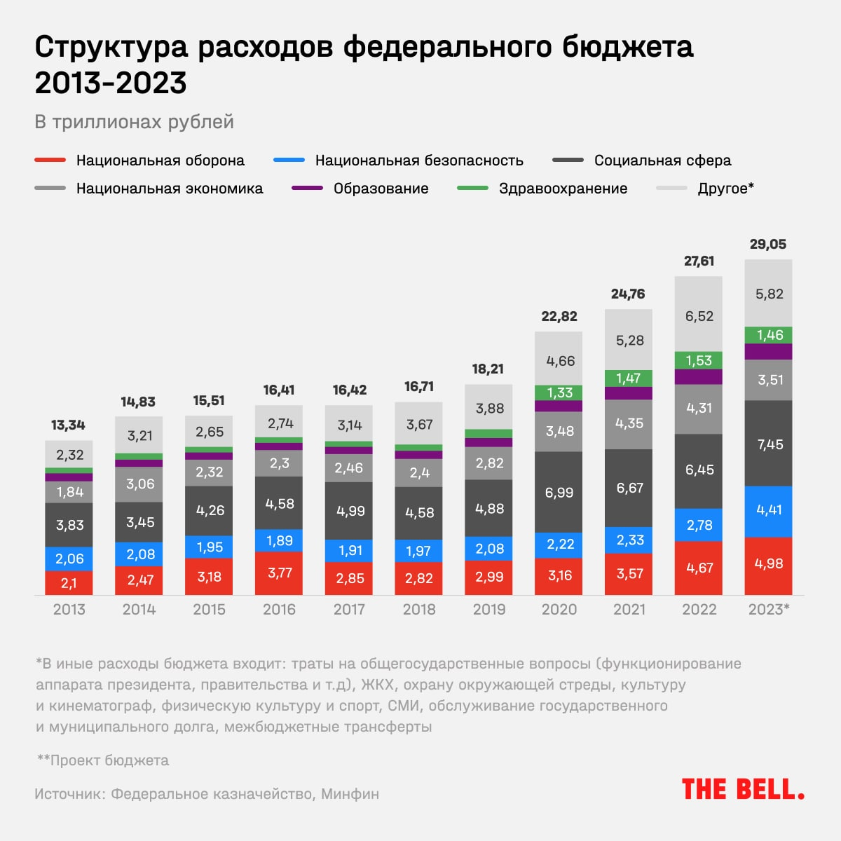Доля трат на национальную оборону в федеральном бюджете ежегодно составляет до 14% до 23% — это больше, чем траты на здравоохранение и образование вместе взятые.