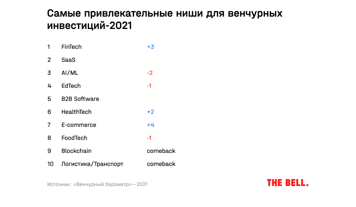 Согласно итогам «Барометра», среди самых востребованных венчурными инвесторами ниш с 2014 года укрепляется FinTech. Также в топ привлекательных направлений регулярно попадает искусственный интеллект и машинное обучение (AI/ML), что неудивительно — этот технологический компонент «зашит» уже в трети всех ИТ-стартапов.