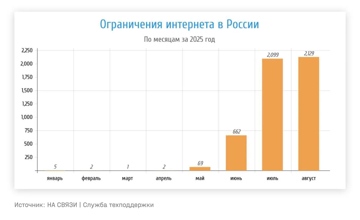 «У меня ощущение, что мы просто живем без мобильного интернета. Я уже не жду уведомлений на улице, всегда беру наличку, в приложения даже не заглядываю», — рассказывает собеседник The Bell в одном из российских регионов. За лето практика отключений мобильного интернета настолько плотно вошла в обиход, что теперь трудно поверить, что еще недавно шатдауны были ЧП. Для сравнения: в апреле по всей России было зафиксировано 2 случая отключения мобильного интернета, в мае их было 69, а в августе — уже 2129, подсчитывал проект «На связи» (анализирует жалобы пользователей и проверяет их техническими средствами).