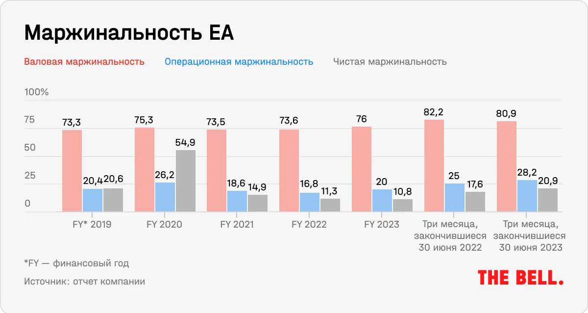 Полные игры — загрузки игр EA на игровых консолях, ПК, мобильных телефонах и планшетах. В категорию «живые услуги и прочее» входят дополнительный контент, связанный с играми, подписки, которые обычно предоставляют доступ к нескольким версиям игр, внутриигровому контенту, онлайн-сервисам и другим преимуществам, а также доход от лицензий, то есть передача IP третьим лицам для распространения и размещения. Они составляют 25,4% и 74,6% чистых продаж соответственно.