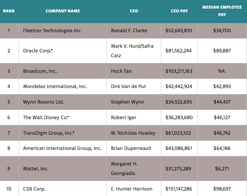 Главы Disney, Mattel и Oracle получают слишком высокие зарплаты, следует из рейтинга The 100 Most Overpaid CEOs 2019, составленного некоммерческой организацией As You Sow (в переводе — «что ты посеял»). Слишком высокие компенсации и разница в зарплатах топ-менеджеров и остальных сотрудников — бич корпоративной Америки и большая головная боль для инвесторов, но ситуация продолжает ухудшаться.