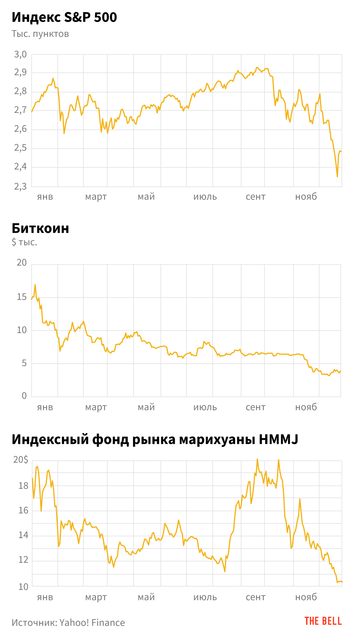 Винить в этом Трампа или нет, но с октября по декабрь падало буквально все. Не будем снова приводить расчеты Deutsche Bank, согласно которым убыток в этом году впервые с 1931 года показали 90% групп активов. Достаточно того, что падение на треть с начала 2018 года показали даже акции компаний самой быстрорастущей и разрекламированной отрасли года — легальной марихуаны. Что уж говорить о биткоине, который еще год назад многие рассматривали как замену золота.