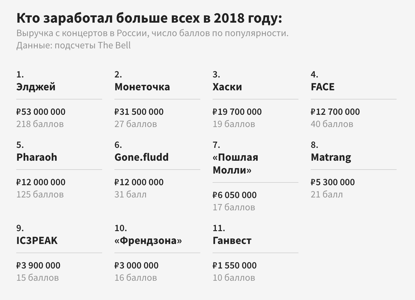 Главные культурные герои 2018 года — молодые музыканты. Их концерты — в сумме больше 40 — отменяли, их тексты проверяли прокуратура и Следственный комитет, возмущенные родители и депутаты писали обращения в госорганы, а Владимиру Путину пришлось отвечать на вопросы про рэперов на итоговой пресс-конференции. Мы составили рейтинг доходов самых успешных и популярных артистов, которые привлекли внимание властей.