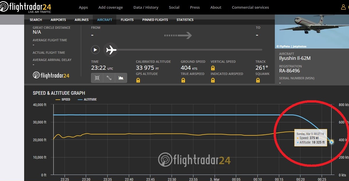 Маршрут перелета. ИЛ-62 вылетел из Москвы 2 марта в 9:34. При взлете трекинговые сервисы зафиксировали его неподалеку от военного аэродрома Чкаловский в Московской области, на котором базируется авиационное предприятие Минобороны ФБУ «Государственная авиакомпания «223-й летный отряд». Вероятно, экипаж отключал транспондер, чтобы не передавать координаты перелета полностью, так как трекинговые сервисы зафиксировали лишь некоторые участки перелета. Первым на самолет обратил внимание телеграм-канал «Другой Ролдугин». Ранее этот борт уже был замечен в Каракасе, а до этого он перебрасывал войска РФ в Сирию.