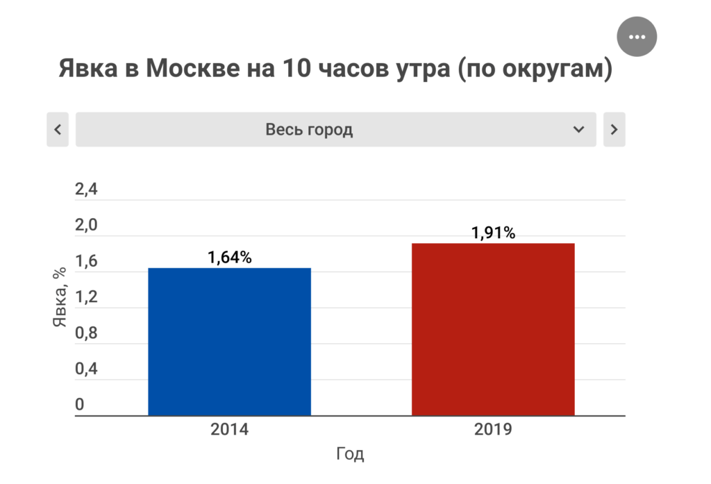 - В 10:40 ЦИК опубликовал первые данные о явке. В среднем по городу она составила всего 0,43%, в некоторых избирательных округах на севере и северо-востоке она превысила 1%. Похожие данные и у движения «Голос», по подсчетам которого явка составила 1,9% (против 1,64% на то же время в 2014 году). В сравнении с этим явка на онлайн-голосовании, которое тестируют в трех округах, оказалась очень высокой: она составила в среднем 34%.