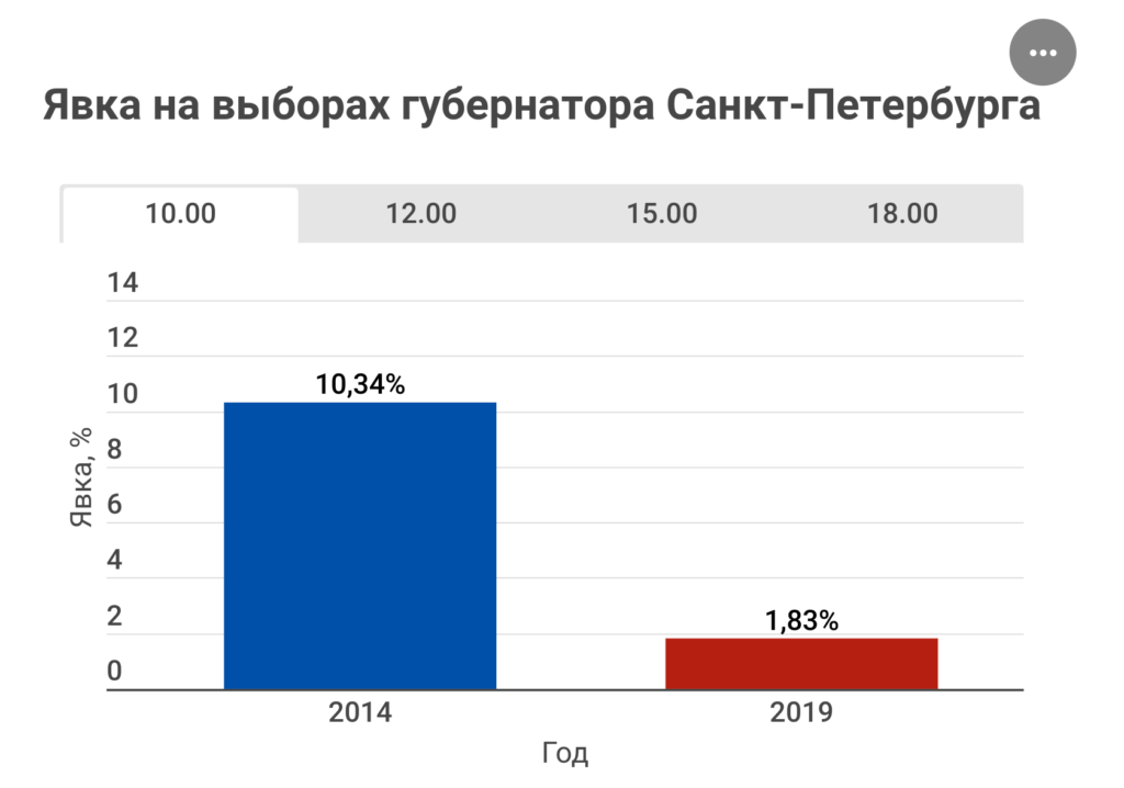 - По данным движения «Голос», явка в Санкт-Петербурге пока низкая, 1,8%. Для сравнения, на то же время (10:00 по Москве) в 2014 году она была почти в 10 раз выше — 10,34%.