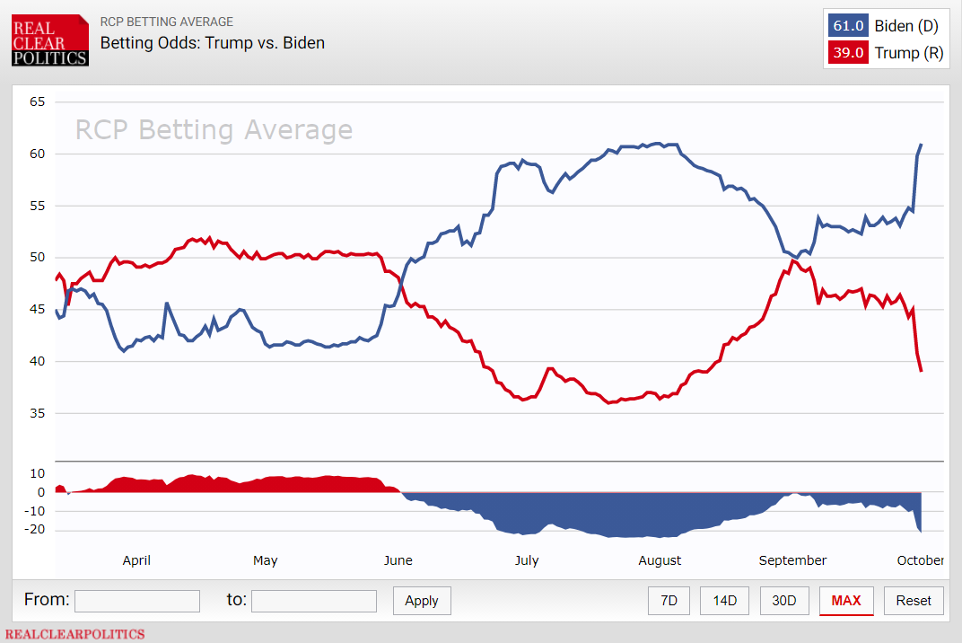 - Букмекеры согласны с опросами: на этот раз они отдают намного более определенное предпочтение одному из кандидатов, и этот кандидат — Джо Байден, показывает сравнение сводного графика ставок букмекерских контор. В котировках букмекеров он опережает Трампа на 22 пункта — 61% против 39% (Клинтон перед выборами 2016 года имела в глазах букмекеров перевес лишь в 3,2 пункта). Еще в начале сентября букмекеры оценивали шансы кандидатов как почти равные, но после первых очных дебатов кандидатов на этой неделе рейтинг Байдена взлетел вверх.