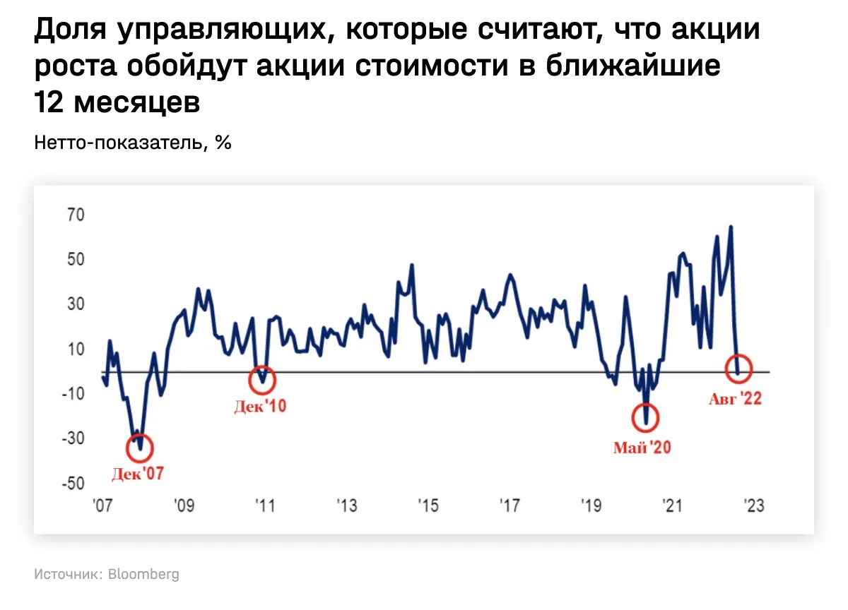 Также августовский опрос Bank of America показал, что впервые с августа 2020 года большинство портфельных управляющих считают, что акции роста обойдут акции стоимости в ближайшие 12 месяцев. Этот опрос проводился до Джексон-Хоул, но явно отображает настроения на Уолл-стрит.