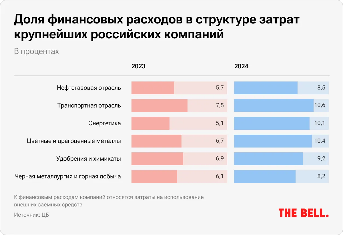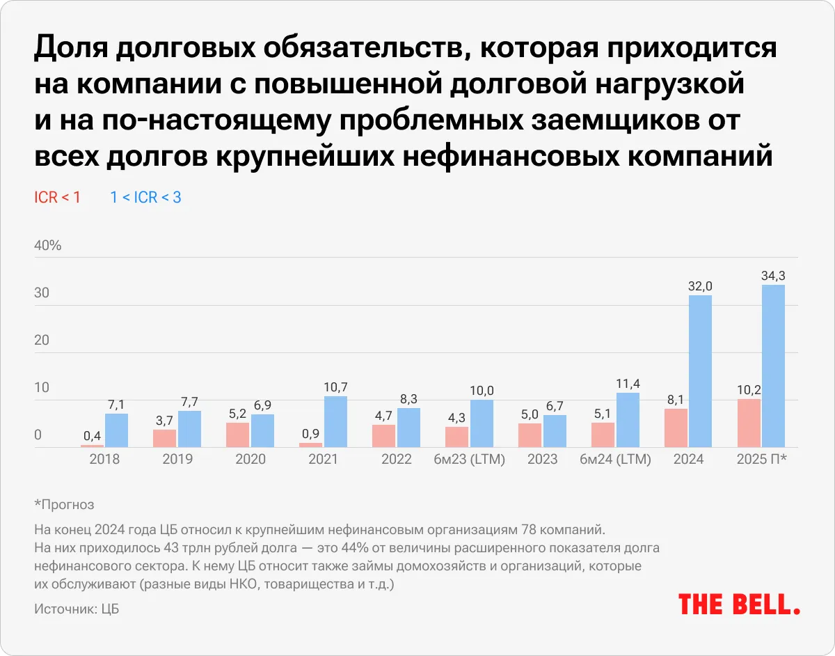 Чем выше ключевая ставка, тем дороже бизнесу обслуживать долги. На конец 2024 года около 40% долга 78 крупнейших российских организаций приходилось на компании с повышенной долговой нагрузкой, насчитал ЦБ. Среди них к проблемным заемщикам еще год назад регулятор относил только 6 компаний. На конец первого квартала 2025-го их число выросло до 13.