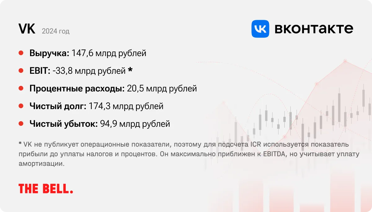 Как итог — в 2024 году операционные расходы группы превышали выручку, но расходы на маркетинг, контент и персонал продолжали расти: по сравнению с 2021 годом они увеличились почти в три раза. Как минимум частично весь этот рост обеспечивался кредитами. За три года чистый долг компании вырос почти в три раза, с 51 млрд до 147,3 млрд рублей. В годовом отчете VK предупредила инвесторов, что как минимум в нескольких ее кредитных договорах с банками были нарушены ограничительные условия — однако компания рассчитывает, что гасить обязательства банки ее не заставят.