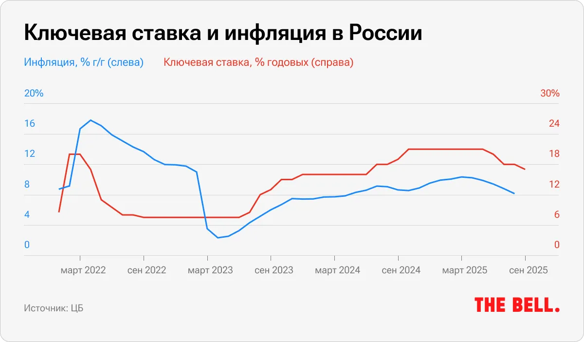 Чуть меньше года назад, когда квартальная инфляция превысила 11%, ЦБ повысил ключевую ставку сразу на 2 пункта, до 21%. Это был абсолютный исторический рекорд — даже экстренное повышение после вторжения в Украину ограничилось 20%. К снижению регулятор приступил только этим летом, впервые за почти три года.