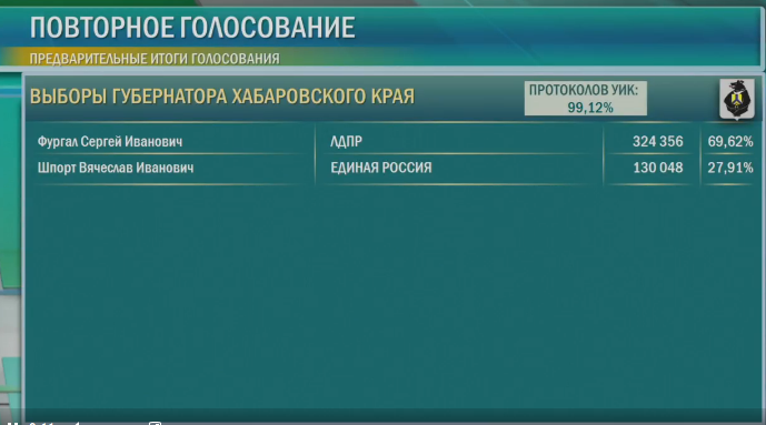 Несмотря на поддержку Владимира Путина, действующий губернатор Хабаровского края Вячеслав Шпорт во втором туре с большим разрывом проигрывает кандидату от ЛДПР Сергею Фургалу. После обработки 99,12% протоколов Фургал набирает 69,62%, Шпорт — 27,91% голосов.