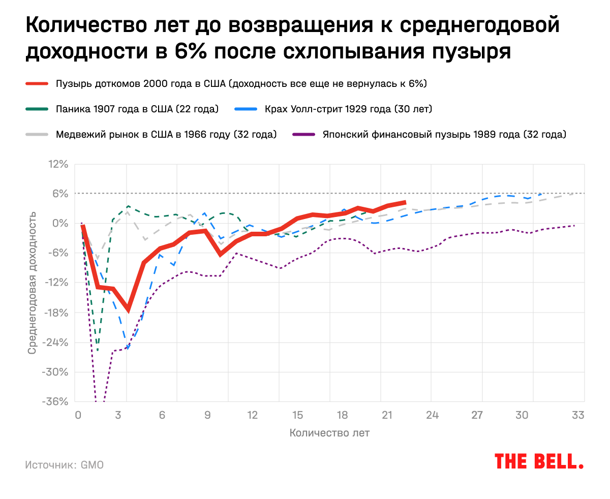 Схлопывание пузырей на рынках может значительно снизить доходность даже долгосрочных инвестиций: если бы вы вложились в индекс S&P 500 на пике пузыря доткомов в 2000 году, то к осени 2021-го рост вашего портфеля не превышал бы средние 6% годовых (с учетом инфляции) — даже несмотря на выдающийся рост в последние 10 лет, когда S&P 500 в среднем прибавлял по 16,6% в год, подсчитали в GMO.
