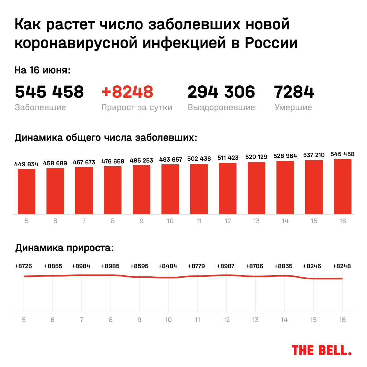 В России показатель суточной заболеваемости уже три недели держится между восемью и девятью тысячами, доля Москвы колеблется у 20%. В столице стабильно больше выздоровевших, чем заболевших.